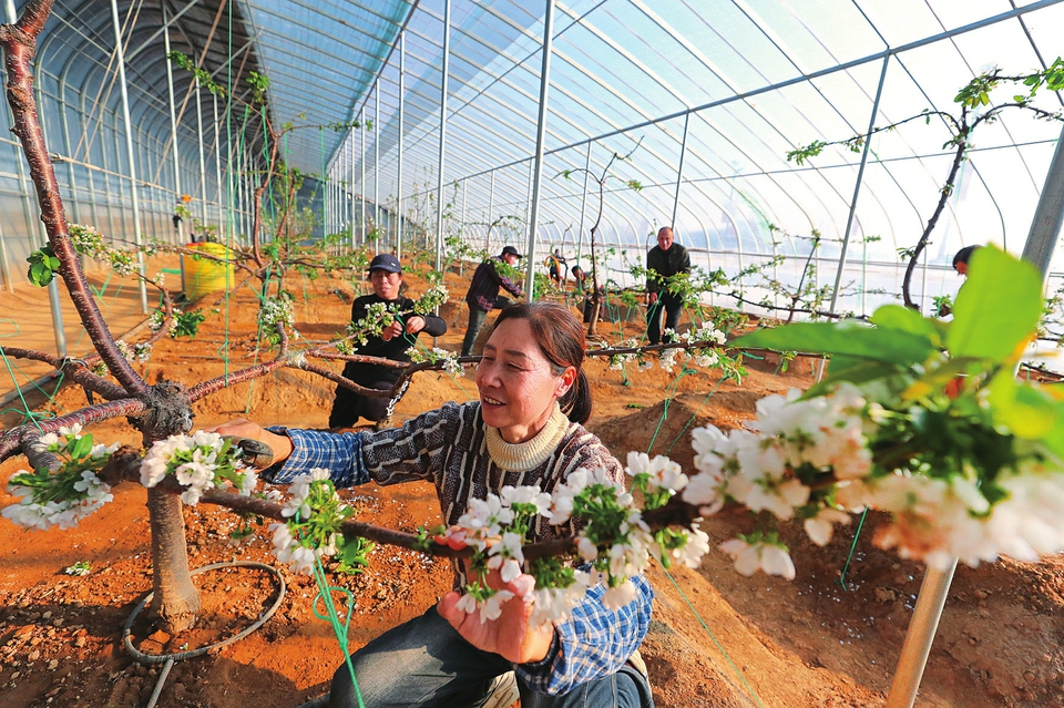 1月7日,浮山县天坛镇南霍村大棚樱桃种植基地,洁白如雪的樱桃花竞相绽放、清香扑鼻,村民正穿梭其间开展修枝、压枝、授粉等精细化管护作业,大棚内呈现出一派热闹景象。