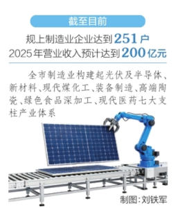 •   本报讯(记者马占富)近日,记者在三一硅能(朔州)有限公司单晶硅片生产车间看到,蓝色的机械手上下翻飞,切片、清洗、分选等智能化工序正高效运转。煤炭能源大市朔州加快产业升级步伐,截至目前,规上制造业企业达到251户,2025年营业收入预计达到200亿元。全市制造业构建起光伏及半导体、新材料、现代煤化工、装备制造、高端陶瓷、绿色食品深加工、现代医药七大支柱产业体系。