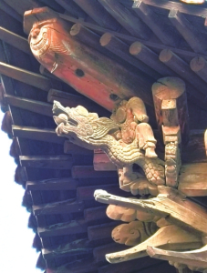 三教堂舞楼是其重要组成部分之一,为山门舞楼式,单檐歇山顶三间,三面观式台口。屋顶黄绿琉璃脊筒瓦,琉璃剪边。有琉璃火珠、琉璃鸱吻、垂戗脊兽、套兽,脊刹为南极仙翁。底层施方形抹角青石柱,方凳础,上层用圆木柱,素平础。柱上施额枋、阑额、蝉肚形雕花雀替。额枋、阑额伸出柱外,断面垂直截去,贴有浮雕戏曲人物的木制护朽。阑额及雀替雕有回文图案,雀替前端刻作龙头。柱头科五踩双下昂,耍头为龙头变体。平身科三攒,出斜栱,耍头雕作小巧玲珑的含珠龙头。角科由昂雕龙,形状与献殿角科由昂近似。内顶施天花,正中为八卦井。