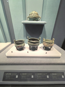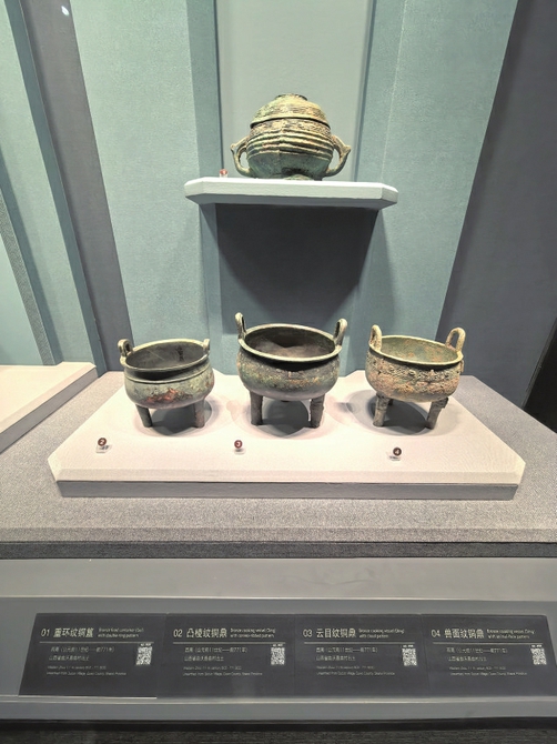 在山西博物院,珍藏着一组簋和鼎,包括一个青铜簋和三个青铜鼎,为重环纹铜簋和凸棱纹铜鼎、云目纹铜鼎和兽面纹铜鼎,它们出土于曲沃县曲村—天马遗址,为西周(公元前1046年至公元前771年)时期文物。