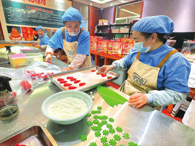 1月11日,尧馍馍花馍非遗工坊内,工人师傅们正在制作手工艺术花馍。作为“三晋老字号”项目,该工坊保留手工定型等传统技艺,并借助电商平台销往全国。