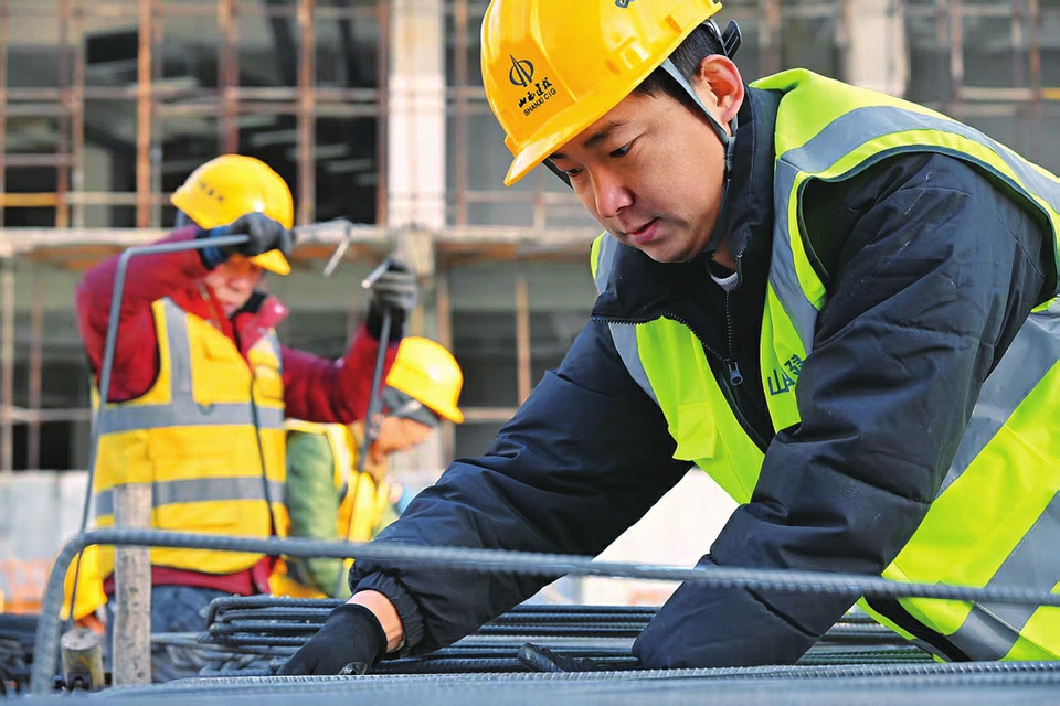 山西建投四建集团产业工人白杰正在绑扎钢筋。闫翔摄