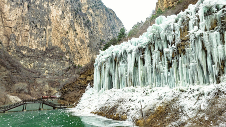 1月13日,平顺县通天峡景区内,昔日的飞瀑流泉凝结成形态各异的冰瀑冰挂景观,绵延数千米,好似步入童话般的冰雪世界。郭世虎摄