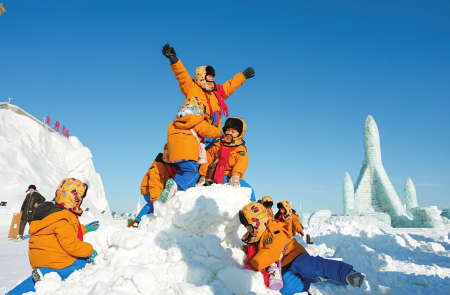 1月14日,广西“小砂糖橘”在位于吉林长春的长春冰雪新天地玩雪。近日,来自广西的十几名3到6岁“小砂糖橘”组成的研学团跨越三千多公里,从温暖南方奔赴东北,开启研学之旅,感受冰天雪地。