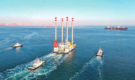 1月22日,由中船武汉船机海西重机自主设计建造的两座新一代“海上移动岛”——TYPE3 PRO型自升式海上作业支持平台,从青岛西海岸新区启航,发往中东波斯湾海域交付。图为新一代自升式海上作业支持平台从青岛西海岸新区离泊赴中东。