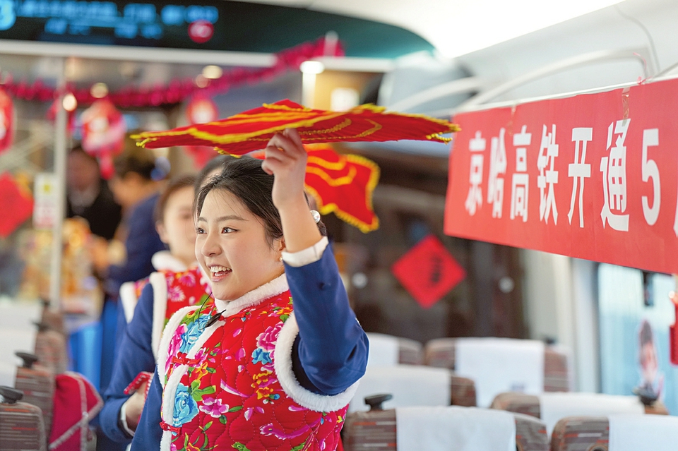 1月22日,全长1198公里的京哈高铁迎来全线开通运营5周年。京哈高铁全线开通运营以来,中国铁路哈尔滨局集团有限公司累计运送京哈间旅客3936万人次。图为乘务员在G902次动车组列车车厢中为旅客表演民俗舞蹈。