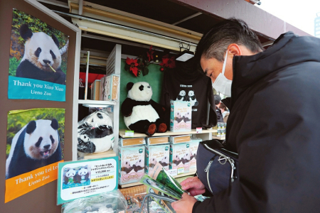 2025年12月25日,在日本东京的上野动物园,游客选购大熊猫“晓晓”和“蕾蕾”的纪念商品。