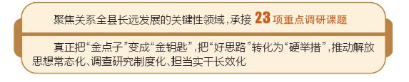 大调研大讨论由县级领导干部牵头,聚焦关系全县长远发展的关键性领域,承接23项重点调研课题,通过深入调研、学习考察、座谈交流、集中研讨等方式,摸清实情、分析症结、研究对策,形成详细具体、操作性强的规范性制度机制。各部门、乡镇聚焦主责主业,主动对标同行业、同领域先进典型,深入查找在思想观念、工作标准、服务效能、政策运用、特色创建等方面存在的差距和不足,进一步明确改进方向和提升举措。