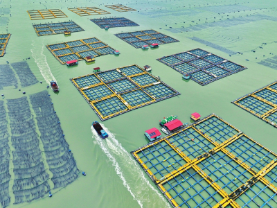 冬季,福建省宁德市海上养殖区一派繁忙景象。船只穿梭于海上田园,渔民在渔排上精心喂养鲍鱼、海参、大黄鱼等。图为1月23日,船只行驶在海上养殖区。