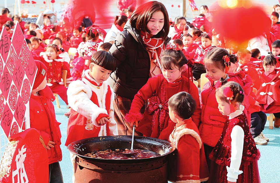 一月二十三日,在浙江省湖州市德清县新市镇第三幼儿园,小朋友体验煮腊八粥。