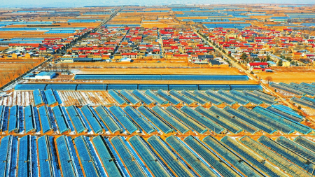 1月22日,夏县胡张乡王村一带,设施杏果大棚与错落有致的村庄民居构成一幅美丽乡村画卷。近年来,当地依托农业资源,规模发展“金太阳”设施杏果产业,带动村民家门口就业增收,为乡村振兴注入持续动力。