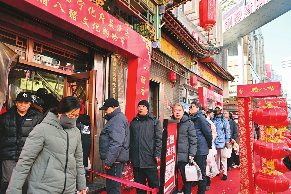 1月26日,第六届宁化府益源庆腊八醋文化购物节现场热闹非凡,市民在太原门店外排起长龙,自带容器等候现打热醋。