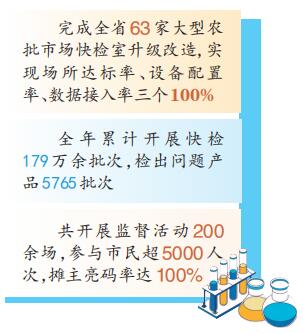 完成全省63家大型农批市场快检室升级改造,实现场所达标率、设备配置率、数据接入率三个100%;通过高频次检测,实现农批市场经营主体100%覆盖;食用农产品追溯,入场经营户“一户一码”赋码率100%……