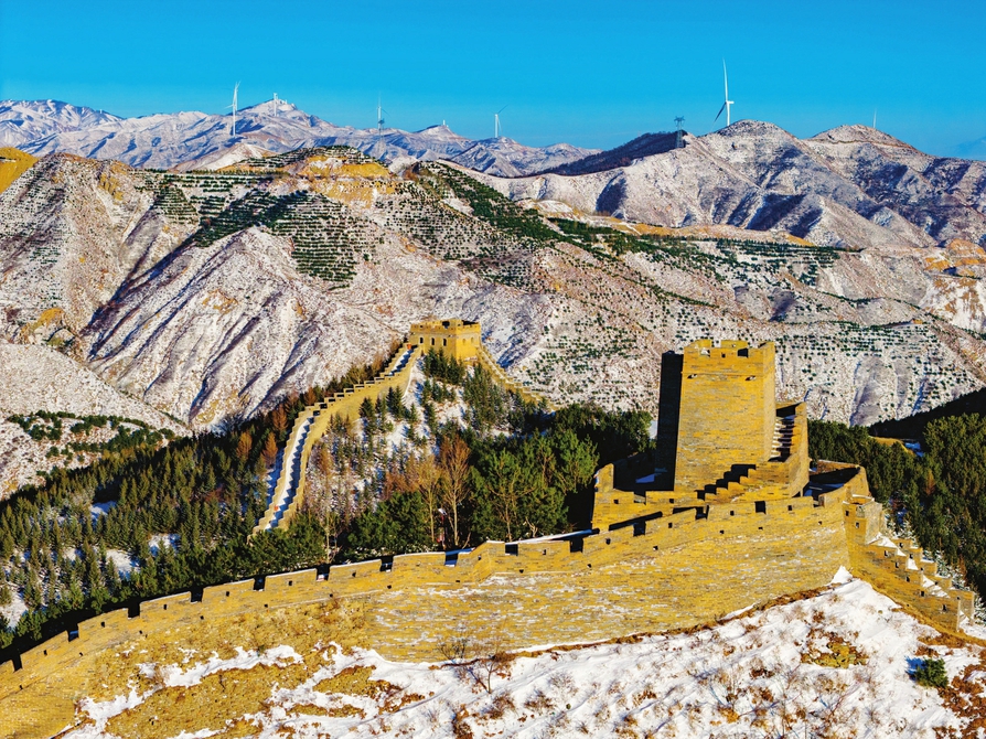 代县雁门关长城在白雪和落日余晖的映衬下更显雄伟壮观。