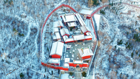 阳泉市林里关王庙景区朱墙覆雪,凛冽空气中浮动着庄重与静谧。