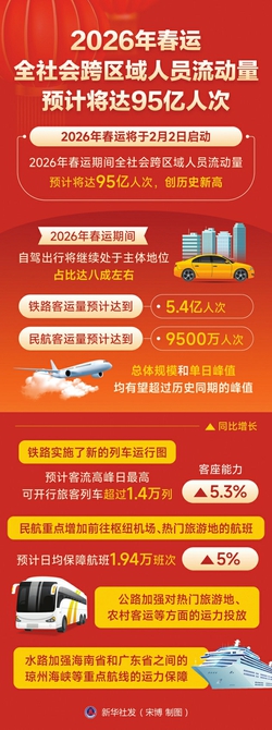 今年春节共有9天假期,返乡探亲、旅游出行需求将更加旺盛。李春临表示,95亿人次的出行中,自驾出行将继续处于主体地位,占比达八成左右;铁路、民航客运量预计分别达到5.4亿人次和9500万人次,总体规模和单日峰值均有望超过历史同期峰值。