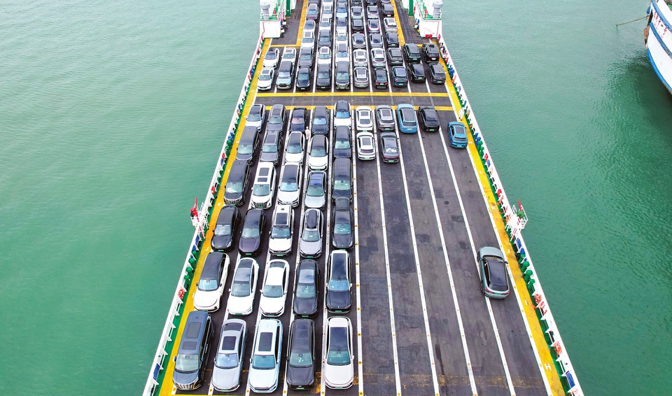 1月30日,在海南省海口市秀英港,新能源汽车驶入“绿源二号”(无人机照片)。作为海南自由贸易港封关运作后的首个春运,海口市相关部门多措并举着力提升运输服务保障能力,保障春运期间新能源汽车顺畅过海。