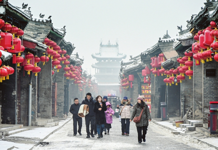 1月30日,平遥县迎来降雪,雪中的平遥古城银装素裹,与大红灯笼相映成趣。游客漫步古城游览观光,赏雪景、品年味,勾勒出一幅瑞雪迎春的美好图景。