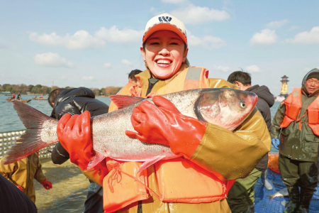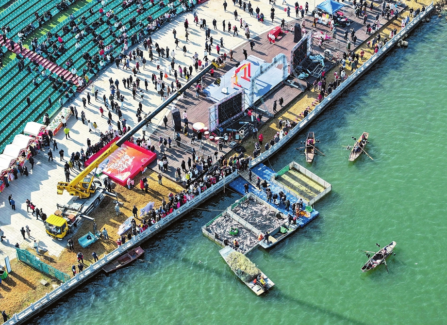 1月31日,渔民在泰州市姜堰区溱湖湾进行冬捕作业(无人机照片)。1月31日,2026溱湖湾冬捕活动在江苏省泰州市姜堰区溱湖湾举办,渔民们在溱湖水域开展冬捕作业,湖区水域呈现出一派人欢鱼跃的丰收景象。