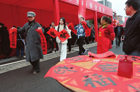 1月31日,在四川省宜宾市筠连县沐爱镇金坪村搬迁安置区,受灾群众领取春联。农历新年前夕,四川省宜宾市筠连县“2·8”山体滑坡灾害受灾群众陆续搬入新居。1月31日,迁入新居的群众在家门前举办百家宴活动喜迎新年。