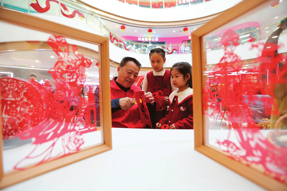 2月4日,剪纸手艺人在甘肃省定西市一商场教小朋友剪纸技艺。2月4日,恰逢立春节气,各地举办丰富多彩的活动,喜迎新春。