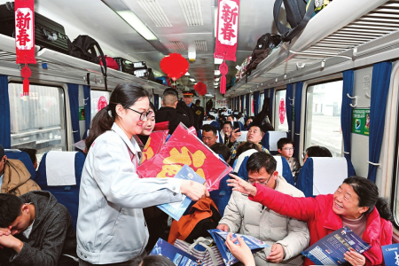 2月5日,招聘企业代表在K8362次列车上向旅客发放招聘传单。当日,由中国铁路上海局集团有限公司合肥客运段联合合肥市相关部门举办的列车招聘会在上海站开往阜阳站的K8362次列车上举行,为返乡游子架起就业对接的桥梁。