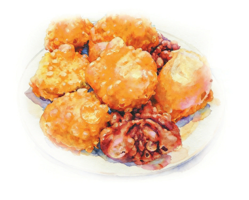 等我疯玩回来时,母亲已将麻饦炸得金黄酥脆,满屋飘香。我迫不及待地抓起一个,顾不得烫,一口咬下去,甜蜜的味道顿时绽放在舌尖,渗透到心里,总是忍不住多吃两个。那个年代,生活条件艰苦,能吃上香甜可口的麻饦,就是一种可以触摸到的真实的幸福。我家姊妹多,每年的好吃头,父母都要平均分配,让我们各自保管。最后一个麻饦,我总是舍不得吃,将它藏到只有自己才能找到的地方,想留到年节的好吃头都吃完了,再慢慢品尝。到最后,那个被我珍藏的麻饦,往往因为放得太久而变质,我只能无奈地看着它,心中满是惋惜。