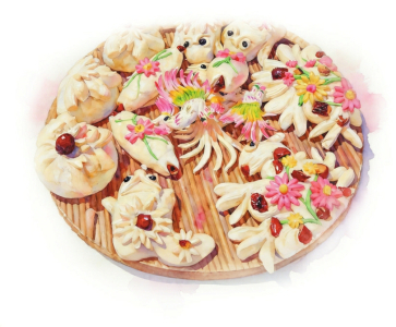 腊月廿八,我从城里赶回家,迎接我的是热火朝天的蒸馍大戏。父亲黑红着脸膛,蹲守于垍火前,松圪枝噼里啪啦脆响,火苗跳跃着、扭动着舔向大铁蒸笼——炊烟三两朵,袅袅入云霄。巧珍婶和大嫂揉面、试碱水,一会儿闻闻酸不酸,一会儿用刀切开看窟窿眼是否匀实,团个“试笼蛋”蒸几分钟,咬一口,有点酸,搋点碱水,再试,刚刚好。母亲配合彩香姑蒸年馍、做造型。案板上,盆里泡着红枣,大的小的,颗颗饱满,碗里放着黑豆,簸箩里的剪刀、梳子、筷子,全能派上用场。母亲拽块面弯成肚子肥头尾瘦的长条,彩香姑手起剪落,头上剪眼睛、鼻子、嘴,身下剪四蹄,黑豆嵌进眼眶,小红枣塞进嘴里,用筷子捏捏,再用梳子从脊背上按出细密的花纹,一只面羊就做好了。鱼的尾巴要长,兔子的耳朵要尖,猪的肚子要大……面团被赋予不同的生命形态,蒸腾出香喷喷乐陶陶的人间烟火。