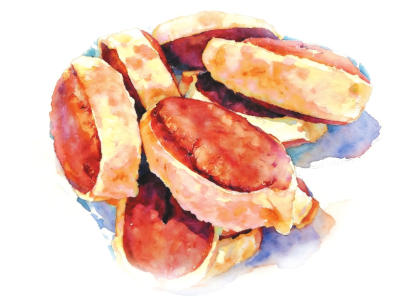 年馍花样繁多,猪、羊、兔、枣山献老爷,枣糕、卷子走亲戚,鱼、青蛙给小孩当“耍货”,枣花人口馍个大量足人人有份……蒸年馍的重头戏是蒸枣山。先将搓成长条的面用筷子对夹成山的形状,再用梳子和刀背印出花草山石图案,一层枣山就做好了。枣山要做三层,一层比一层大,拐弯处及山与山之间按上大红枣,起连接作用。在古代,“三”代表着吉祥、力量与成功。彩香姑将蒸好的枣山放在小箅子上,再和母亲慢慢捯饬进笼屉,一个不小心,枣山就会变形散架,就得重新“造山”。蒸枣山须旺火,父亲早掏空火膛,只留一个熊熊燃烧的松树圪桩,长长的火舌从四面八方亲吻蒸笼,院子像被镀上一层仙气,烟雾缭绕间,是沸腾滚烫的生活。枣山寓意“早发”,祭祀于神像前的C位,红枣白面,巍巍高山,饱含人们对美好生活的期盼——红红火火,蒸蒸日上。蒸好的年馍一笼笼揭在炕席上,定了皮拾进筛子,凉透后再摆进缸里。