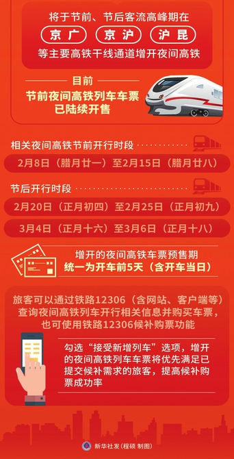 据了解,2月8日至10日上海至长沙、武汉、郑州,北京至哈尔滨、长春、沈阳、郑州,沈阳至哈尔滨,郑州至西安,广州至成都,南京至武汉等方向仍有余票。旅客可以通过铁路12306(含网站、客户端等)查询夜间高铁列车开行相关信息并购买车票,也可使用铁路12306候补购票功能,勾选“接受新增列车”选项,增开的夜间高铁列车车票将优先满足已提交候补需求的旅客,提高候补购票成功率。