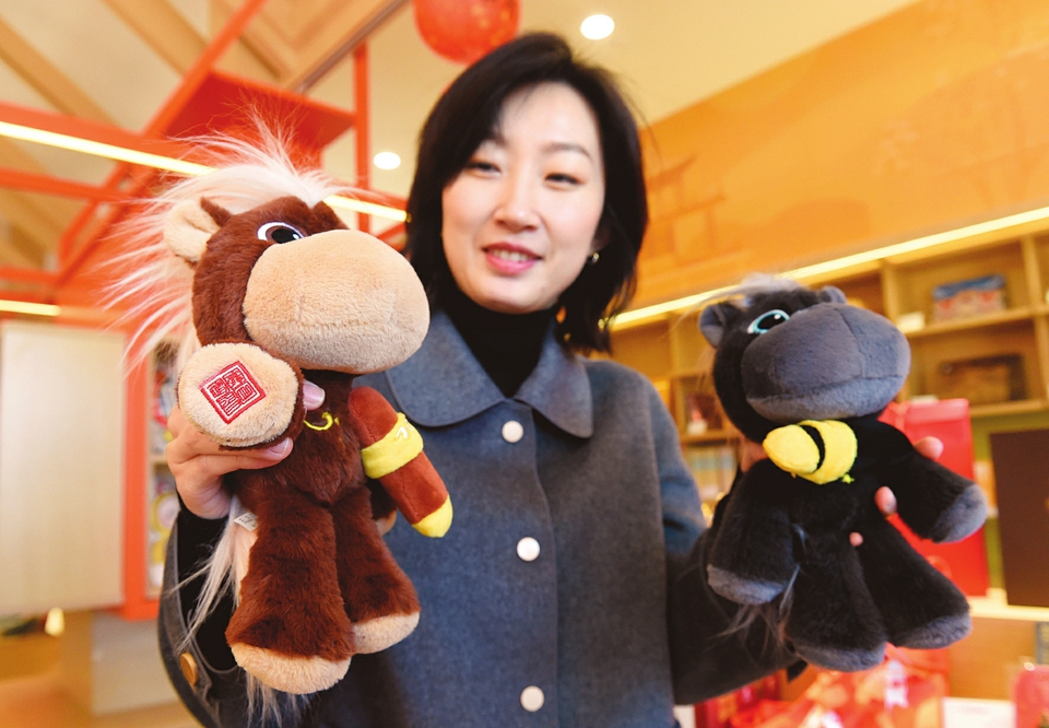 2月7日,2026年圆明园新春游园会拉开序幕。今年圆明园将古典园林、文化艺术与新春喜庆、互动体验深度结合,打造出游园新特色。图为工作人员介绍文创产品马首毛绒公仔。