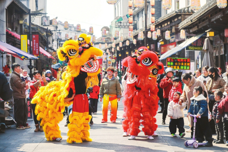 2月8日,游客在寿昌古镇老街上观看传统舞狮表演。近期,浙江省建德市寿昌古镇举办传统民俗迎新春活动,民俗踩街、舞龙舞狮、马年主题灯展等活动,吸引八方游客前来体验古镇传统年味,进一步激活新春消费市场,为当地文旅经济发展注入新动能。