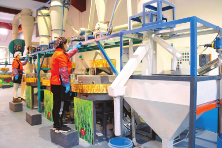 2月8日,在阳城县凤城镇石家庄村的晋城市佳艾农业科技有限公司生产车间内,工人正在操作石磨面粉加工设备赶制订单。春节临近,石磨面粉迎来消费旺季,企业开足马力加紧生产,全力保障节日市场供应。
