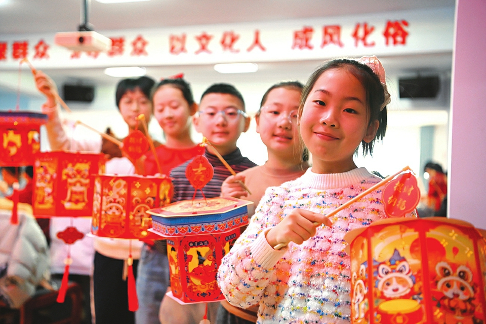 图②:2月9日,在广灵县西关社区新时代文明实践站,孩子们制作花灯感受年味儿。