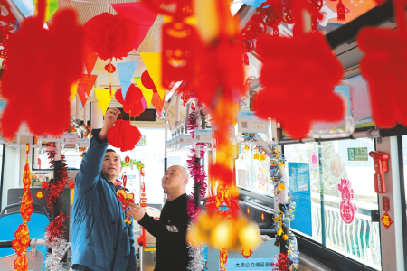 图①:2月6日,太原公交集团第三分公司五车队驾驶员与工作人员齐动手、巧布置“年味儿车厢”。