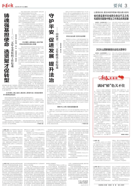 2025年,在以习近平同志为核心的党中央坚强领导下,省委、省政府团结带领全省人民坚持以习近平新时代中国特色社会主义思想为指导,全面贯彻落实党的二十大和二十届历次全会精神,深入学习贯彻习近平总书记对山西工作的重要讲话重要指示精神,坚定扛牢党中央赋予的重大使命任务,完整准确全面贯彻新发展理念,坚定不移推动高质量发展、深化全方位转型,全省经济顶压前行、稳中有进,产业转型势头良好,能源革命纵深推进,新质生产力稳步发展,内需潜力有效释放,改革开放持续深化,城乡融合发展步伐加快,美丽山西建设成效明显,民生福祉不断增进,社会大局保持和谐稳定,“十四五”规划确定的主要目标任务基本完成,中国式现代化山西实践迈出新的坚实步伐。这些成绩的取得,根本在于以习近平同志为核心的党中央领航掌舵,在于习近平新时代中国特色社会主义思想科学指引,是全省广大干部群众埋头苦干、奋力拼搏、积极进取的结果,其中也饱含着驻晋部队和广大官兵的辛勤付出、无私奉献。