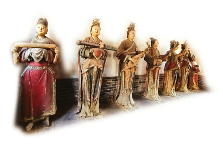 踏入唐叔虞祠的山门,一种不同于圣母殿的沉静气息便环绕而来。享堂之内,时光以另一种方式凝固——14尊元代的乐伎泥塑,手持笛、笙、琵琶、三弦,分列两班,悄然静立。这组乐伎的珍贵,在于其“唯一”。在我国,元代彩塑乐伎实物多已湮灭于岁月尘埃,而此处,14位乐师组成的完整乐队,却跨越700余年风雨,完好地驻守于此。享堂之后,是大殿。这里供奉的,正是晋祠最初的主人,唐叔虞。他静坐于神龛之中,身穿蟒袍,手执玉圭,面容雍容平和,那穿越记载的眼神,仿佛仍带着一片桐叶的翠色与分量。