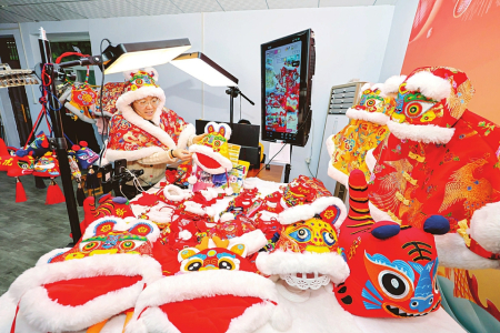 近日,运城市万荣县一家手工制品企业内,员工赶制虎头帽、披肩、香包等特色民俗产品,借直播拓宽销路,保障春节市场供应。图为该企业电商主播在直播间介绍产品。