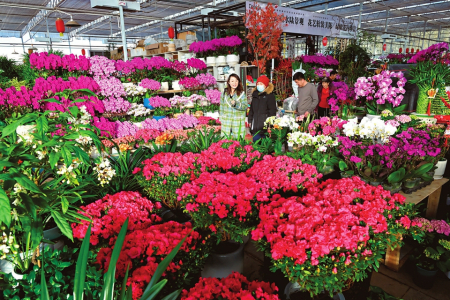 2月7日,长治市潞州区鹿家庄花卉市场,市民在选购花卉。春节临近,长治市各大花卉市场迎来销售热潮,许多市民前来选购蝴蝶兰、杜鹃、金桔等寓意吉祥的年宵花与绿植,为家中增添节日色彩。