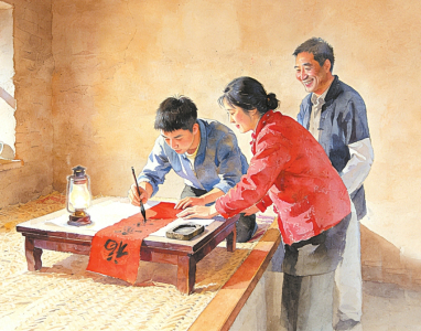这时我就闭上眼,让自己回到那个煤油灯摇晃的夜晚。家里的文房四宝,哪件不是从烟火里熏出来的?那半块残墨,平日里收在灶王爷画像后面,沾着香火气;那方缺角的砚台,常被母亲用来压腌菜缸的盖布,浸着咸涩气;那两支秃笔,笔杆被炕烟熏得泛黄。唯一像样的四方炕桌,桌面上深一块浅一块的油渍,是经年累月的饭食痕迹——今日的糨糊,就要在这烟火斑驳的桌上熬成。研墨时,煤油灯的光在手上跳跃。水是井里刚打上来的,带着地底的寒气,倒在砚台里,要用手温慢慢化开。墨香起来了,不是书斋里清冷的香,是和着炕烟、酸菜味道的、暖烘烘的香。母亲教我把红纸抚平,那红在灯下像灶膛里将熄未熄的火,随时要重新烧起来。