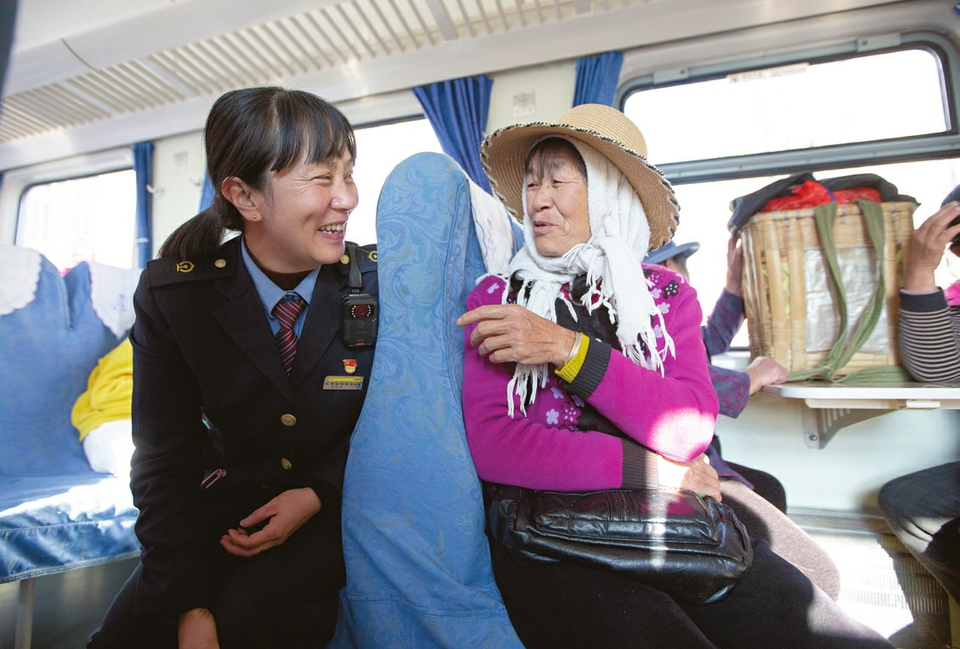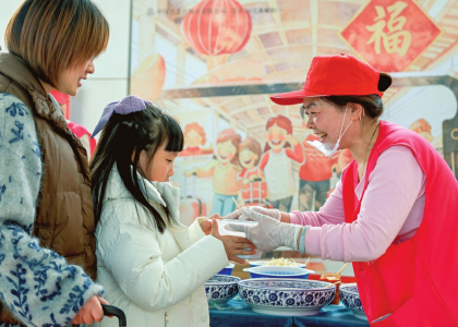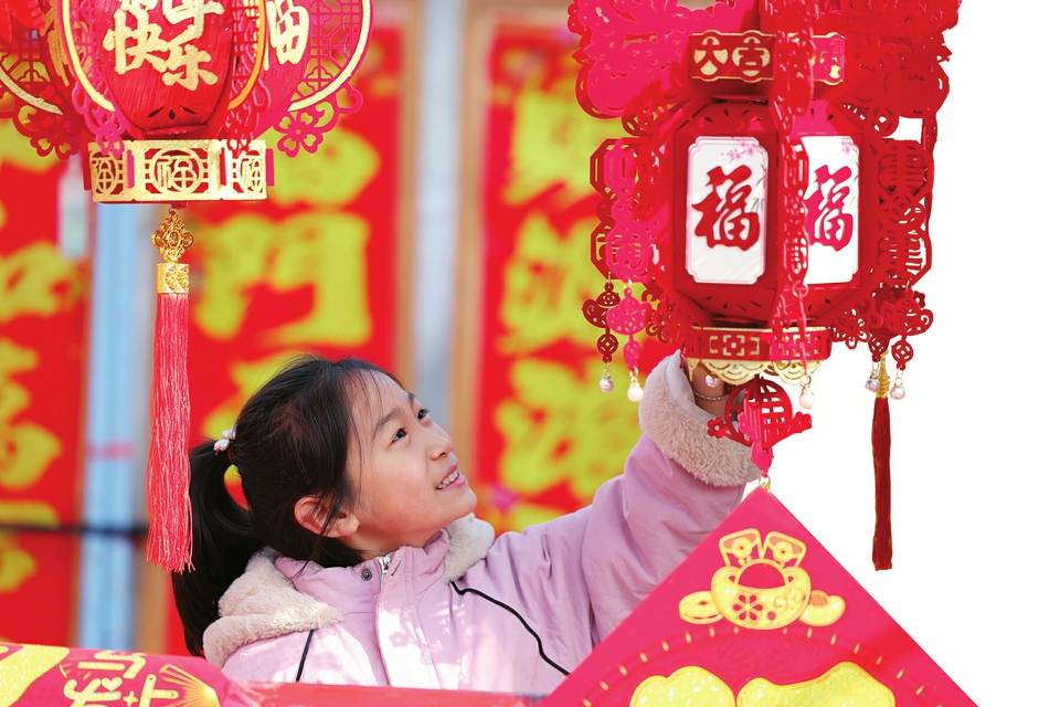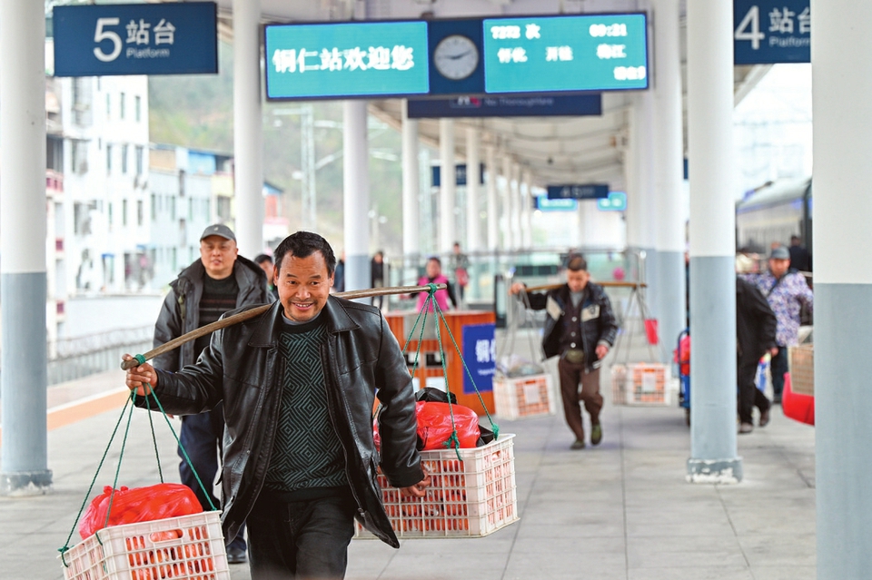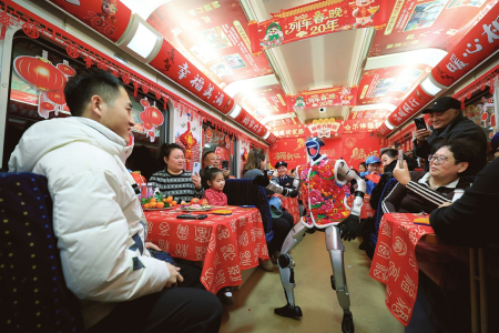 图①:2月13日,在山东省临沂市郯城县郯城街道年货市场,小朋友在选购春节饰品。 图②:2月12日,在贵州省铜仁市铜仁站,来自湖南的菜农挑着果蔬出站。 图③:2月13日,在江苏镇江站,爱心面馆工作人员为旅客送锅盖面。 图④:2月13日,列车员与菜农在5652次列车上交谈。 图⑤:2月13日,仿生机器人在T48次列车“春晚”现场表演舞蹈。