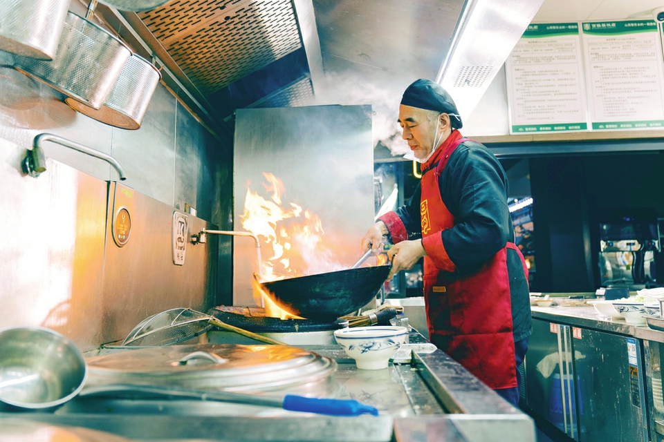 他的手在食材间游走,丸子要现炸,烧肉得用前一日剩下的酱汤回锅,白菜必须是平遥当地产的“包心白”,口感甜而不柴。
