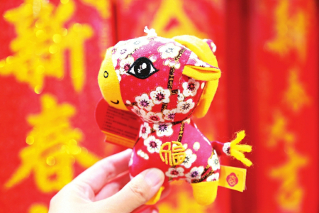 2月15日,人们在云南省蒙自市一商场展示选购的马造型饰品。