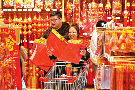 2月14日,在浙江省嘉兴市南湖区一家大型商场“年货一条街”,市民在选购福字。