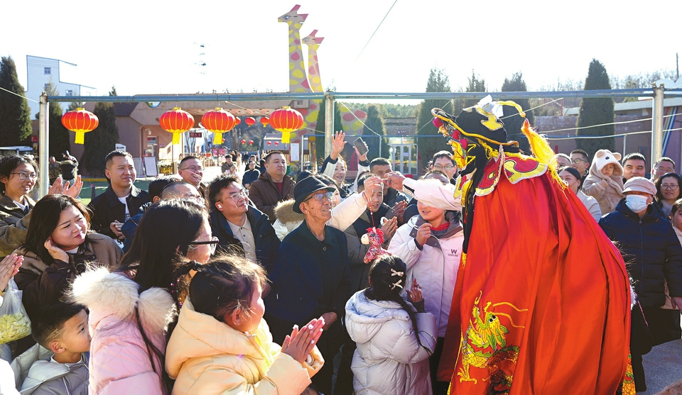 2月17日,在盂县的山西华北奕丰生态园,主题打卡点与民俗表演吸引众多游人互动。程瑜摄