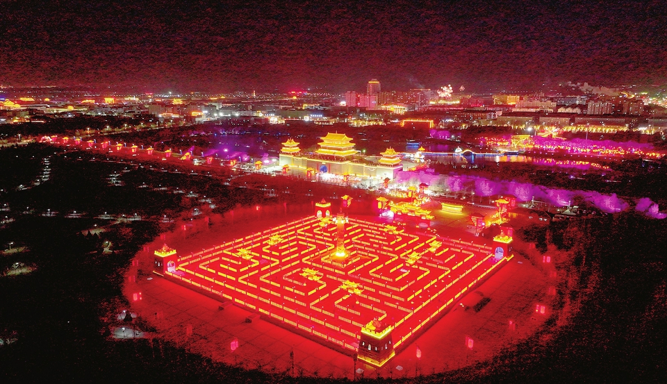 2月18日拍摄的宁夏盐池县九曲民俗文化园和长城关夜景。