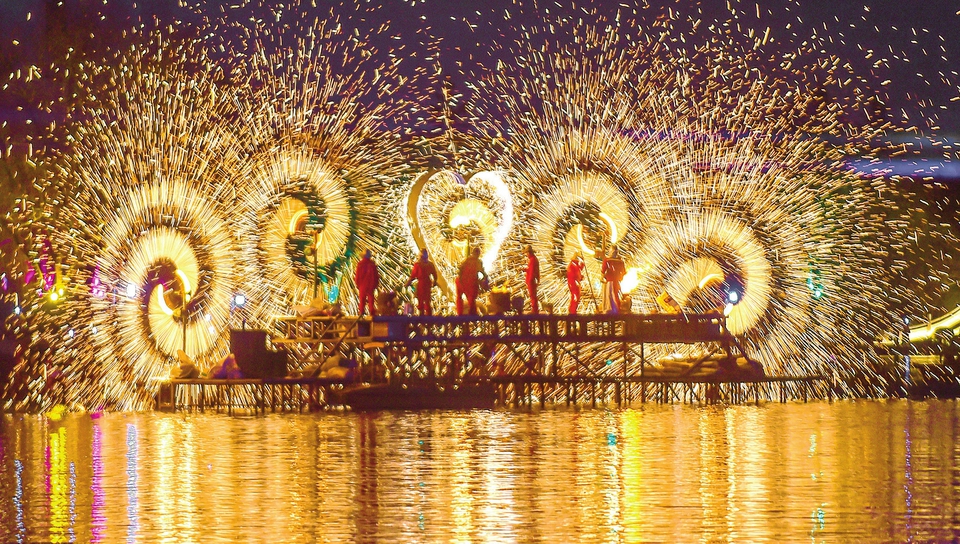 2月17日在河南省洛阳市隋唐城遗址植物园“神都上元灯会”上拍摄的水上打铁花表演。