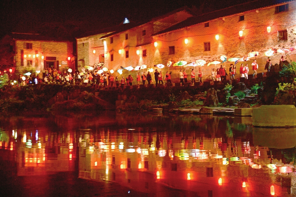 2月18日,人们高举鱼龙灯在广西贺州昭平县黄姚古镇老街游行。