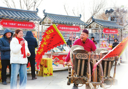 2月18日,平遥古城南大街上热闹非凡。福、禄、寿、禧、财五位福将身着传统服饰,热情地与游客互动、合影送福;社火巡演热闹开锣,舞狮、抬阁、秧歌等民俗节目轮番上演;街边小店的炒碗托滋滋作响,陈醋酸混着咖啡香味弥漫整条街道……