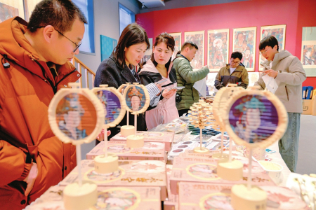 2月19日,游客在永乐宫景区文创品展厅选购。春节假期,该景区以“壁画”为创意原型的文创产品备受游客喜爱。